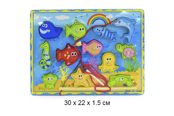 В наборе: 12 рыбок на магнитах, удочка с магнитными наконечниками, шнурок.