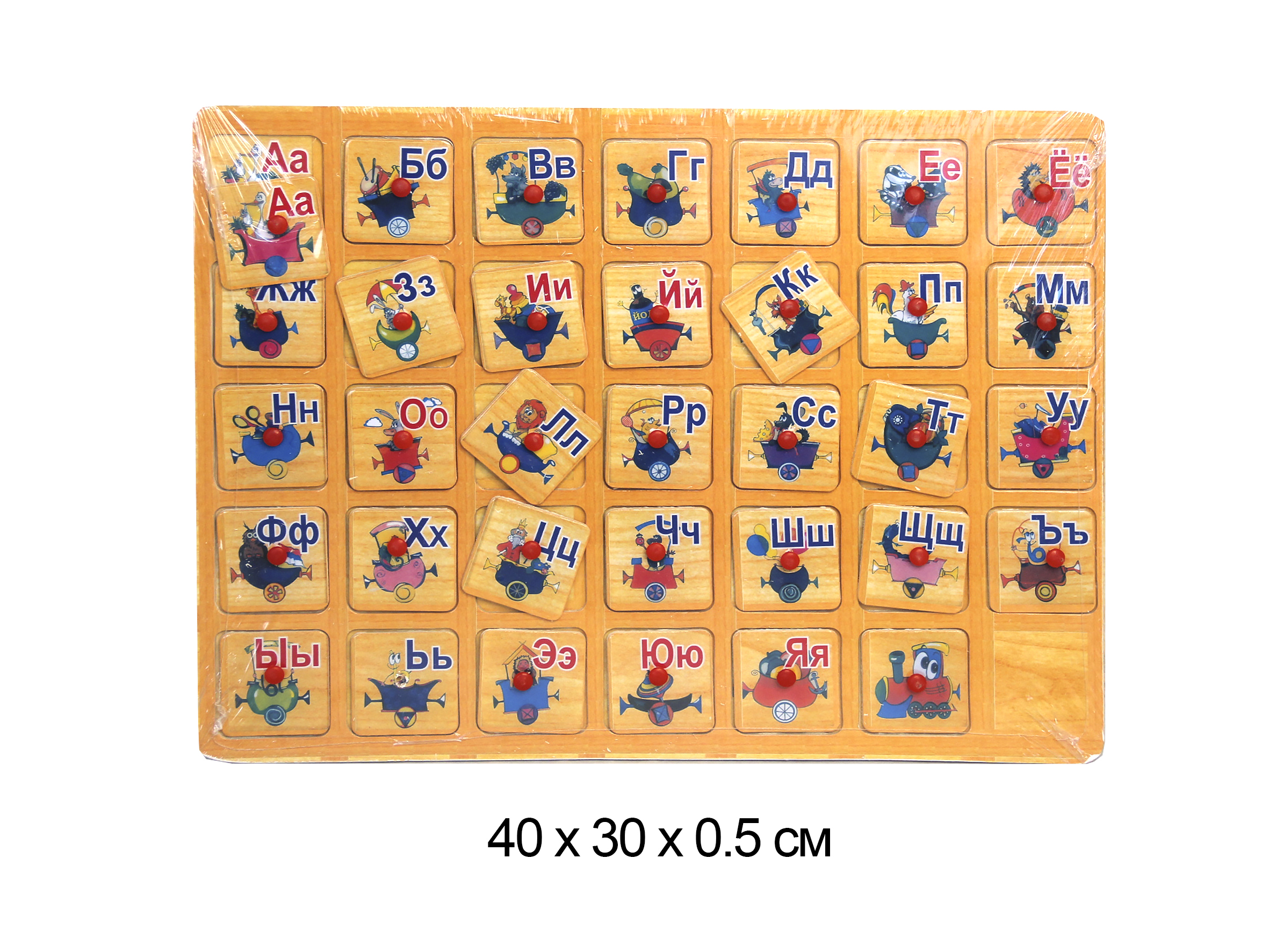 - Деревянная игрушка арт. 1902-72/1902-31-1 Русский алфавит в пленке.)×Деревянная игрушка арт. 1902-72/1902-31-1 Русский алфавит в пленке.)Знание алфавита - важный шаг на пути школе. Эта яркая игрушка поможет быстро выучить буквы и цвета, а также весело провести время. Задачей малыша является правильно расположить яркие буковки в прорези деревянного основания. В комплекте деревянная основа и 33 буквы, размер каждой фигурки 2.5-4.5 см.