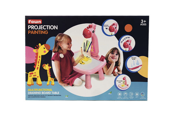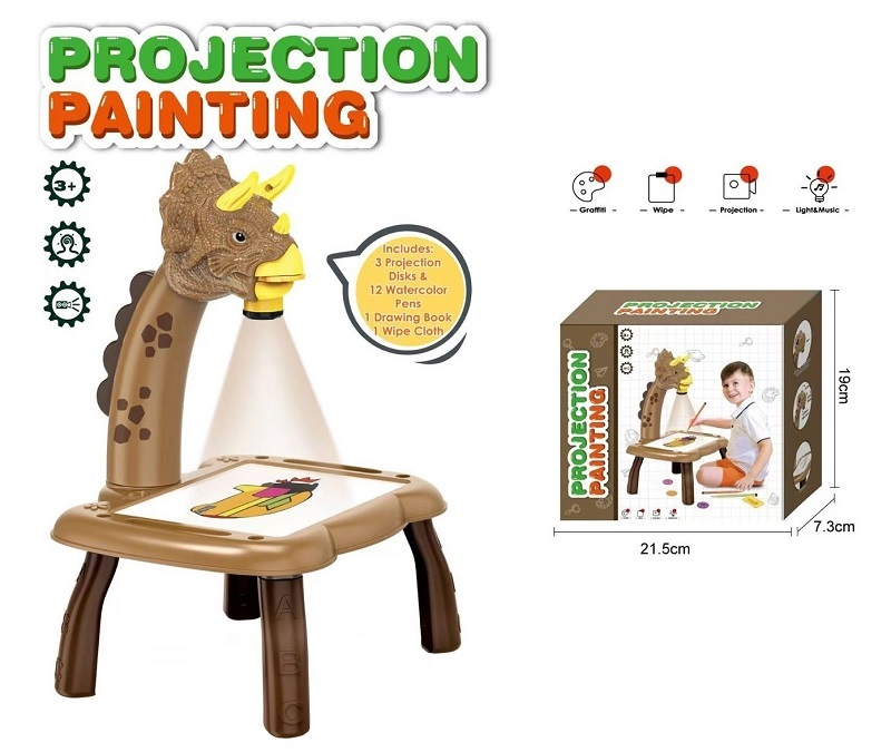 Выполнено приспособление в виде детской настольной лампы, прикрепленной к пластиковому столику на небольших ножках. Лампа имитирует голову динозавра и проецирует на столик свет. Игрушка комплектуется тремя слайдами, каждый из которых предлагает восемь разных рисунков. Все картинки проецируются на доску. Ребенку необходимо обвести и раскрасить понравившееся изображение с помощью имеющихся в комплекте фломастеров на водяной основе либо собственных карандашей. Можно рисовать прямо на самом столике, либо положить на него бумагу.