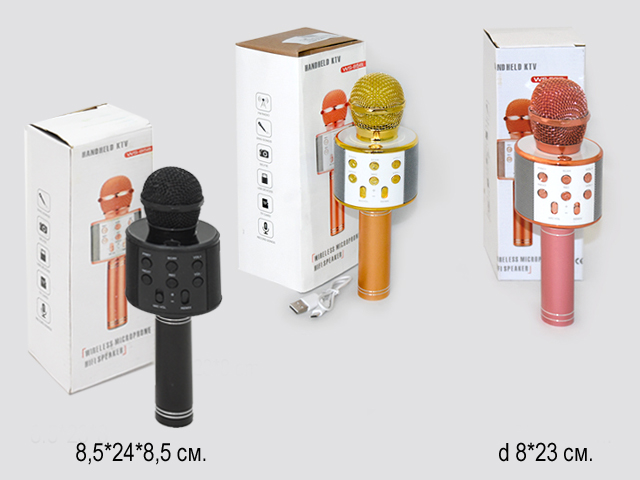 - Микрофон музыкальный арт. 858WS В кор._×Микрофон музыкальный арт. 858WS В кор._Портативный микрофон можно использовать как переносную колонку или караоке-микрофон в комбинации со смартфоном или планшетом. Модель оснащена беспроводным модулем Bluetooth,USB, и удобными кнопками для воспроизведения музыкальных файлов. Микрофон имеет встроенный аккумулятор и динамики, а значит что он не "привязан" к розетке.