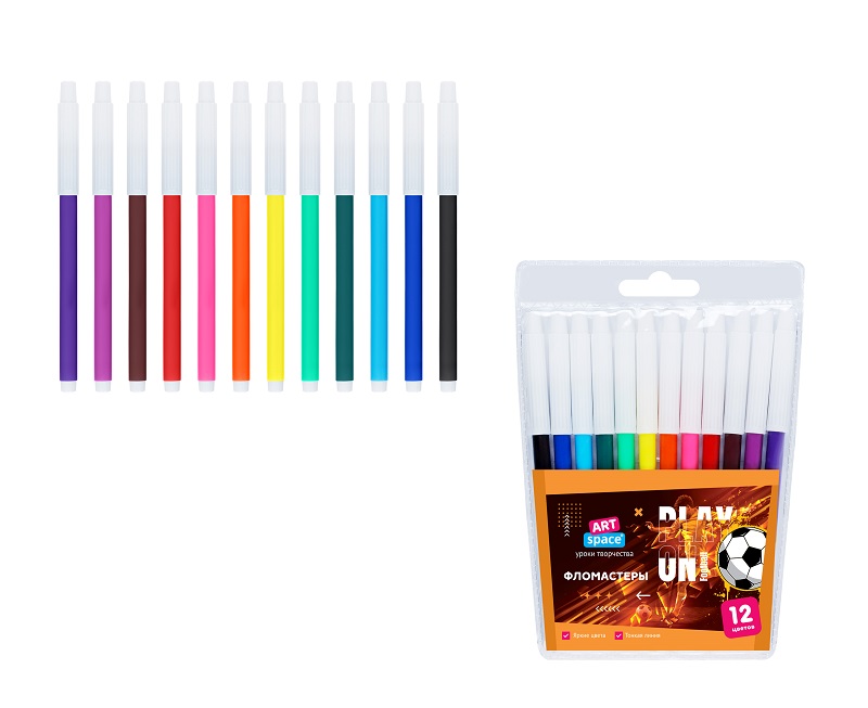 - кв_Фломастеры арт. WP_92102 ArtSpace "Футбол", 12цв., ПВХ, европодвес×кв_Фломастеры арт. WP_92102 ArtSpace "Футбол", 12цв., ПВХ, европодвесФломастеры серии «Футбол» представлены с чернилами ярких цветов и невентилируемым колпачком белого цвета. Толщина линии письма составляет 1,0 мм. В наборе 12 ярких цветов. Тип наконечника – конический. Несмываемые фломастеры на водной основе нетоксичны. Набор фломастеров упакован в ПВХ-пакет с европодвесом и ярким вкладышем.