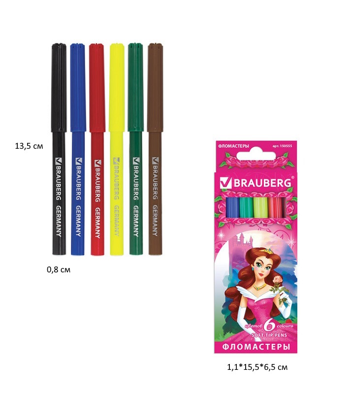 113.91 руб. - кс_Фломастеры арт. 150555 BRAUBERG "Rose Angel", 6 цветов вентилируемый колпачок, картонная упаковка×кс_Фломастеры арт. 150555 BRAUBERG "Rose Angel", 6 цветов вентилируемый колпачок, картонная упаковкаРисование фломастерами способствует развитию воображения, мыслительных процессов, мелкой моторики рук у детей, координации движений кистей и пальцев и повышает способность концентрироваться и фокусировать внимание. Обладают яркими насыщенными цветами в количестве 6 штук. Благодаря толщине линии письма 1 мм и диаметру пишущего узла 1,8 мм процесс раскрашивания становится легким. Длина письма составляет 500 м: такого расхода хватит надолго. Фломастеры изготовлены на водной основе, поэтому они безопасны и легко смываются с большинства материалов и кожи. Полипропиленовый корпус значительно продлевает срок службы фломастеров. Колпачок имеет специальные прорези для вентиляции, которые способствуют прохождению воздуха при попадании в дыхательные пути. Рекомендованы для детей от 3-х лет.