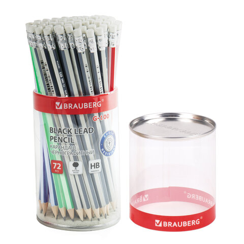 Карандаш чернографитный BRAUBERG "G-100", 1 шт., HB, с ластиком, корпус ассорти, 181714