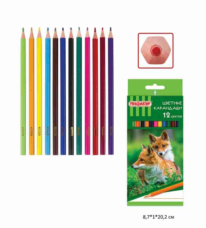 кс_Карандаши цветные арт. 181334 ПИФАГОР "ЛЕСНЫЕ ЖИТЕЛИ" 12 цветов шестигранныеНабор состоит из 12 цветов: розовый, красный, желтый, оранжевый, салатовый, зеленый, голубой, синий, фиолетовый, коричневый, серый, черный. Шестигранная форма сечения корпуса позволяет карандашу не скатываться с поверхности стола. Карандаши изготовлены из пластика и имеют лакированный корпус, который при разломе не образует острые края и безопасен для детей. Легко затачиваются. Грифель диаметром 2,65 мм обладает повышенной прочностью. Все карандаши заточены и поставляются в картонной упаковке с европодвесом.