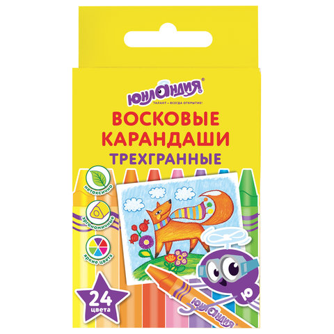 кс_Восковые карандаши трехгранные арт.227291 ЮНЛАНДИЯ "ЮНЛАНДИК И МУДРЫЙ ЛИС", НАБОР 24 цвПалитра состоит из 24 ярких и насыщенных цветов. Полностью безопасны в использовании, не токсичны и не имеют резкого запаха. Благодаря своему составу карандаши пишут мягко, и ребенку не придется прикладывать усилия в процессе рисования. Трехгранная форма корпуса и диаметр 8 мм делают их удобными для тренировки руки к письму у дошкольников и детей младшего школьного возраста, формируют навык правильного захвата, снижают нагрузку на кисти рук. Каждый карандаш завернут в бумажную этикетку, что предохраняет от загрязнений, снижает скольжение, увеличивает прочность.