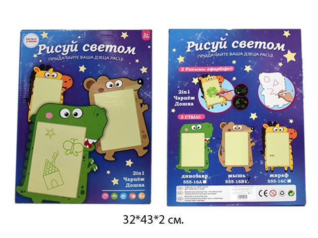 Доска для рисования в темноте состоит из фотолюминесцентного ПВХ-материала, который быстро накапливает свет от источника освещения, и потом некоторое время светится в темноте, постепенно затухая. Яркость свечения можно регулировать продолжительностью свечения, а толщину линии можно менять удалением светового маркера от планшета. Рисунок держится на доске примерно 30 минут, после чего полностью исчезает, и можно снова рисовать. Источник питания для светового маркера: батарейки AG3x1,5V (есть в комплекте)