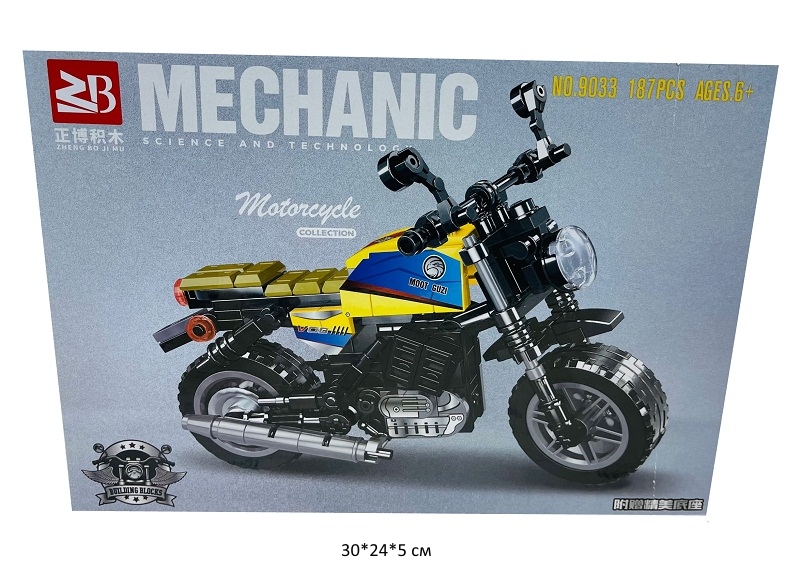 Конструктор арт. 9033 Мотоцикл 187 дет. в кор.•Кузов обладает выразительной центральной линией и отличными аэродинамическими характеристиками. Модель пополнит коллекцию автолюбителя