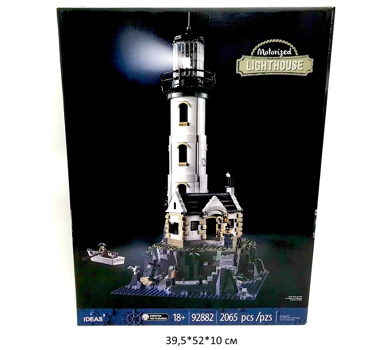 Конструктор арт. 92882/87010 Маяк 2065 дет. в кор._~В башне маяка моторизованное вращающееся освещение со специально разработанными линзами Френеля, в коттедже светящийся камин. Коттедж и башня расположены на кирпичном скалистом обнажении со ступенями, ведущими к пирсу и пещере с пиратскими сокровищами. Минифигурки смотрителя маяка и моряка, а также сборная гребная лодка и фигурки чаек и кошек дополняют восхитительную экспозицию. Модель в собранном виде украсит интерьер дома или офиса. Если убрать элементы на задней части башни, можно увидеть лестницу до самого верха, если поднять крышу коттеджа, можно рассмотреть детализированный интерьер и обнаружить сундук с сокровищами в пещере.