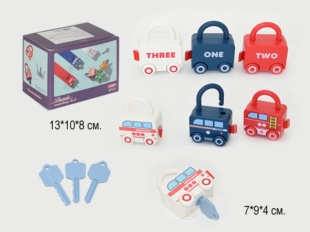 - Игра головоломка арт. MT033512 Машинки с ключами в кор._×Игра головоломка арт. MT033512 Машинки с ключами в кор._Обучающая игра головоломка "Машинки и ключики" понравится любому ребенку. В комплект входят 3 машинки и 3 ключика. У каждой машинки есть замочек и ключик, который подходит только к ней. Игра заключается в том, что ребёнку необходимо подобрать правильный ключик к каждой машинке. На каждой машинке с одной стороны нанесены точки, соответствующие цифре, а с другой — эта цифра написана на английском языке. На каждом ключике тоже есть цифры, таким образом, выучив их, малышу будет легче подобрать подходящий ключик. Головоломка развивает мелкую моторику, знание цвета, цифр и логическое мышление. У "машинок-замочков" крутятся колеса, и ими можно играть как обычными машинками. Игрушка предназначена для детей от 1,5 лет.