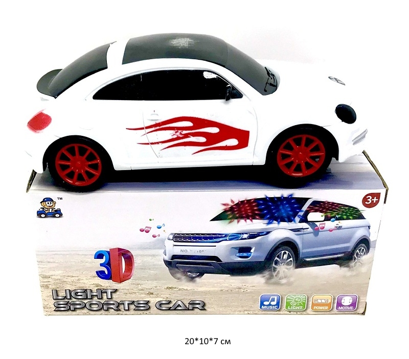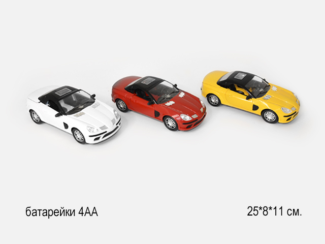 - Машина на батар. арт. 5526 Спорткар свет, звук в кор.)×Машина на батар. арт. 5526 Спорткар свет, звук в кор.)Красочный спортивный автомобиль со световыми и звуковыми эффектами понравится любому ребенку! Игрушка катается по комнате в хаотичном направлении, при возникновении препятствий, автоматически поворачивает в другую сторону. Работает от 4 батареек типа АА (в комплект не входят).