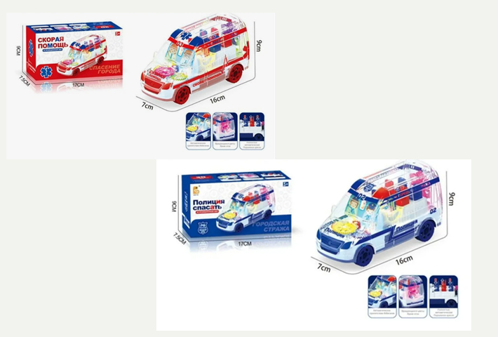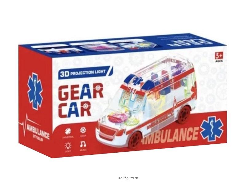 Машина на батар. арт. 6608-16B Скорая помощь шестеренки, вращение, свет, звук в кор.)Машина на батар. арт. 6608-16B Скорая помощь шестеренки, вращение, свет, звук в кор.)